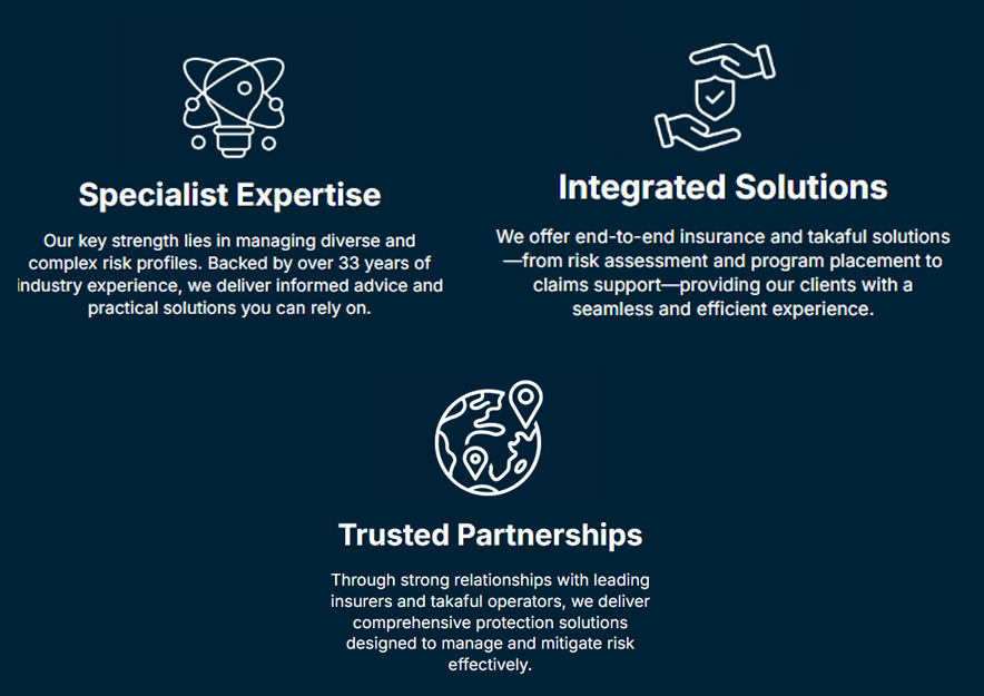 We offer end-to-end insurance and takaful solutions—from risk assessment and program placement to claims support—providing our clients with a seamless and efficient experience.